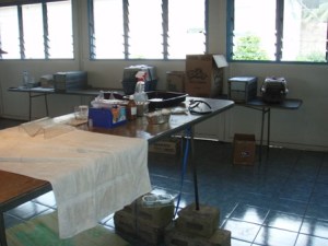 In late June the Esther Honey Foundation sent two vets, an assistant and their coordinator over to Aitutaki on a spay and neuter campaign. Prez and I gave a cash donation, provided free accommodation for two of the girls and I spent a day assisting in surgery. It was a crazy day and my hat is off to the vets who were working in very primitive conditions. In 3 ½ days, they managed to desex almost 100 cats and could have done more if there had been more cages available to trap them. Here’s a photo of the operating room…